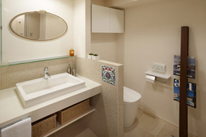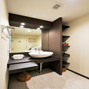 不同尋常將洗臉臺(tái)下方的空間改造成似儲(chǔ)物格一樣的空間,日用品及家居用品都找到了安放的位置,達(dá)到了空間的最大化利用。洗臉臺(tái)的一側(cè),既可擺放物品又可作為臨時(shí)的工作區(qū),休閑區(qū),實(shí)用度得到了最大的提升。